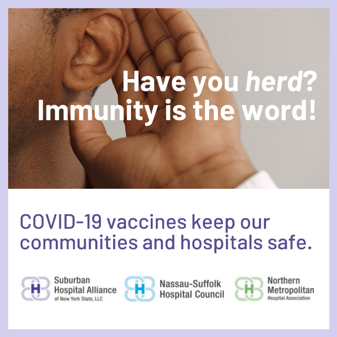 The Suburban Hospital Alliance of New York State is committed to working with our region’s hospitals and public health officials in this final push to reach herd immunity.  Our “Have You Herd” campaign is all about educating the public about the importance of vaccination and everyone’s responsibility to protect themselves, their loved ones, and their community.